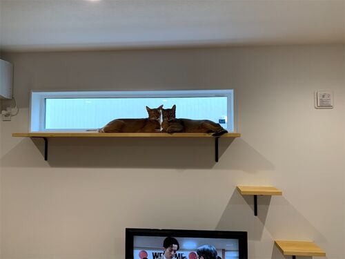 引越し作業がまだまだ残っているので部屋がゴチャゴチャしています…。そんな中こんな光景で癒されました。 キャットウォーク作って本当に良かったw 早速何箇所かクロスやられましたけど…